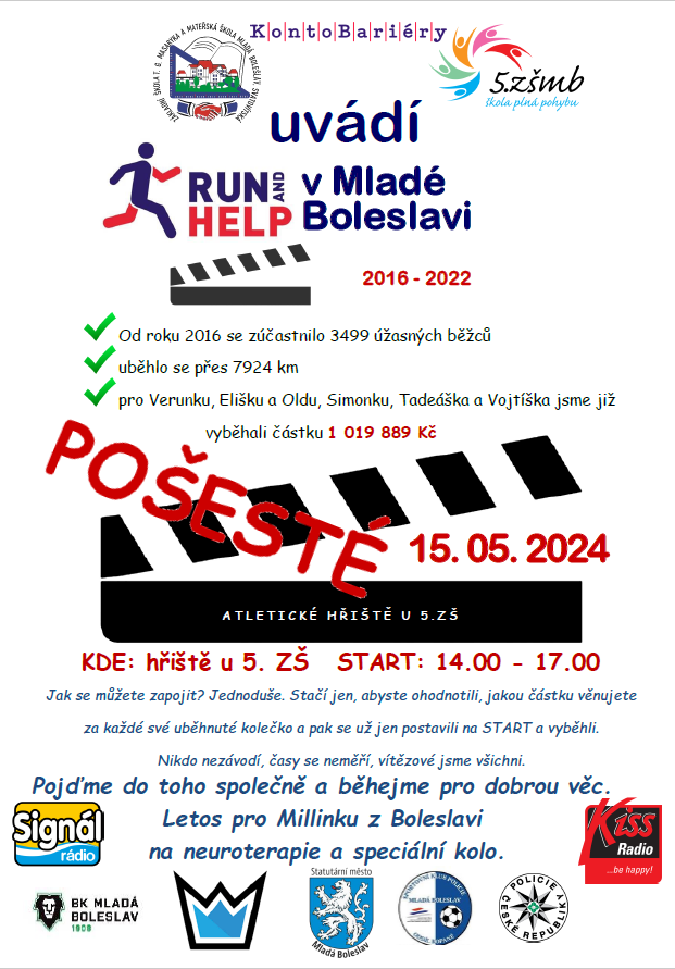 Pomáhat může být jednoduché. Stačí obout tenisky a vyběhnout. Už 15. května se na atletickém hřišti u 5. základní školy v Mladé Boleslavi uskuteční další ročník oblíbené dobročinné akce, která spojuje pohyb s pomocí těm, kteří to potřebují. Od roku 2016 se do této iniciativy zapojily už tisíce lidí.