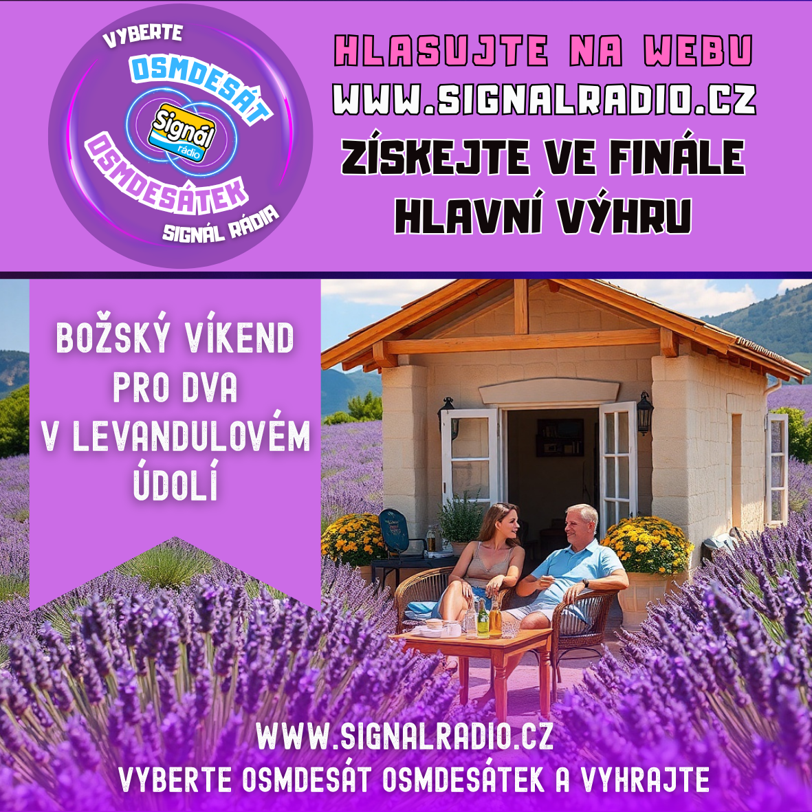 Hlasováním se dostáváte do soutěže o denní výhry (tričko a hrneček Signál rádia, Prima+ na 3 měsíce). Zároveň jste tak ve hře o hlavní cenu Božský víkend pro dva v Levandulovém údolí. Hlavní cenu předáme ve vysílání v pátek 24. dubna 2026.